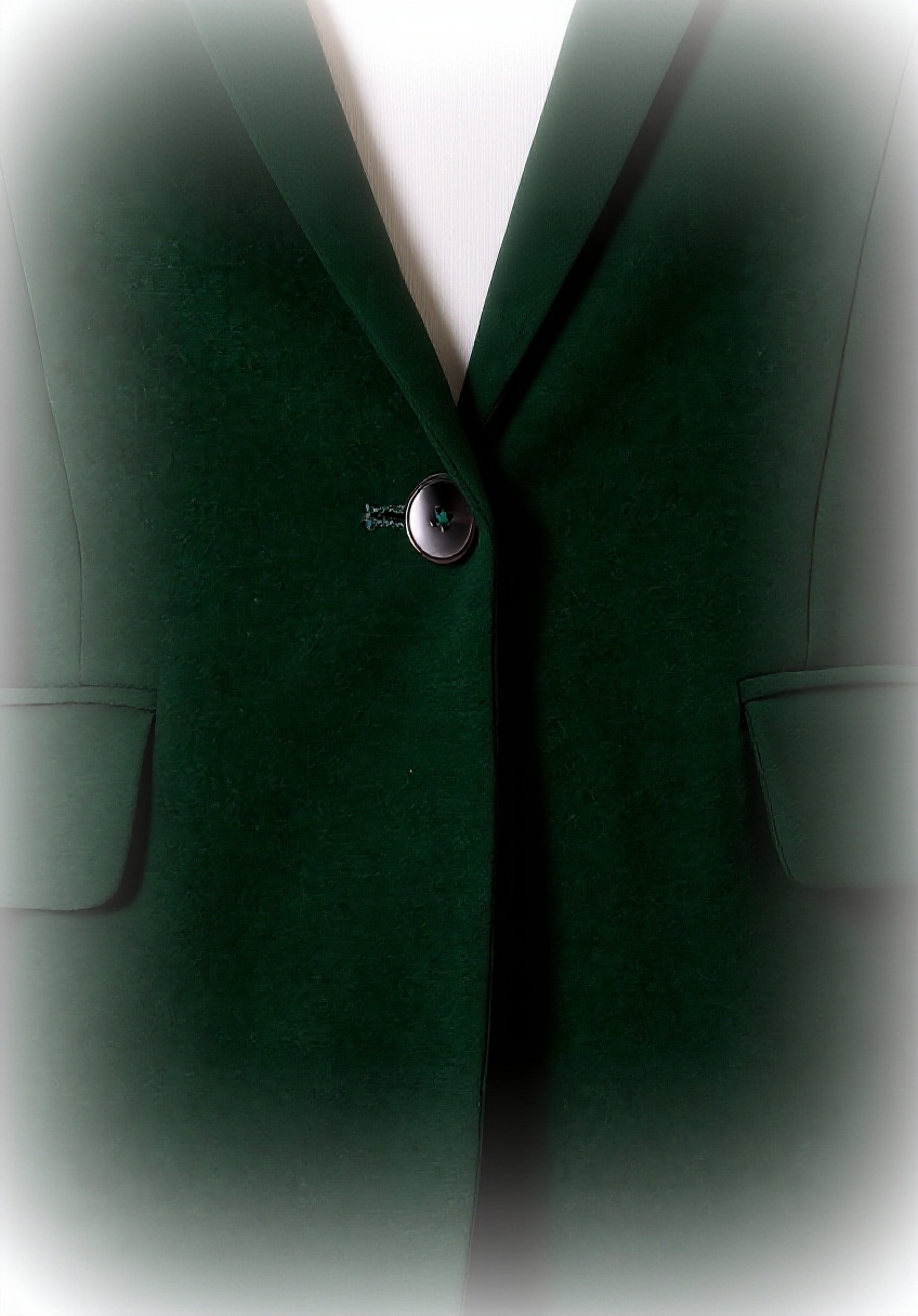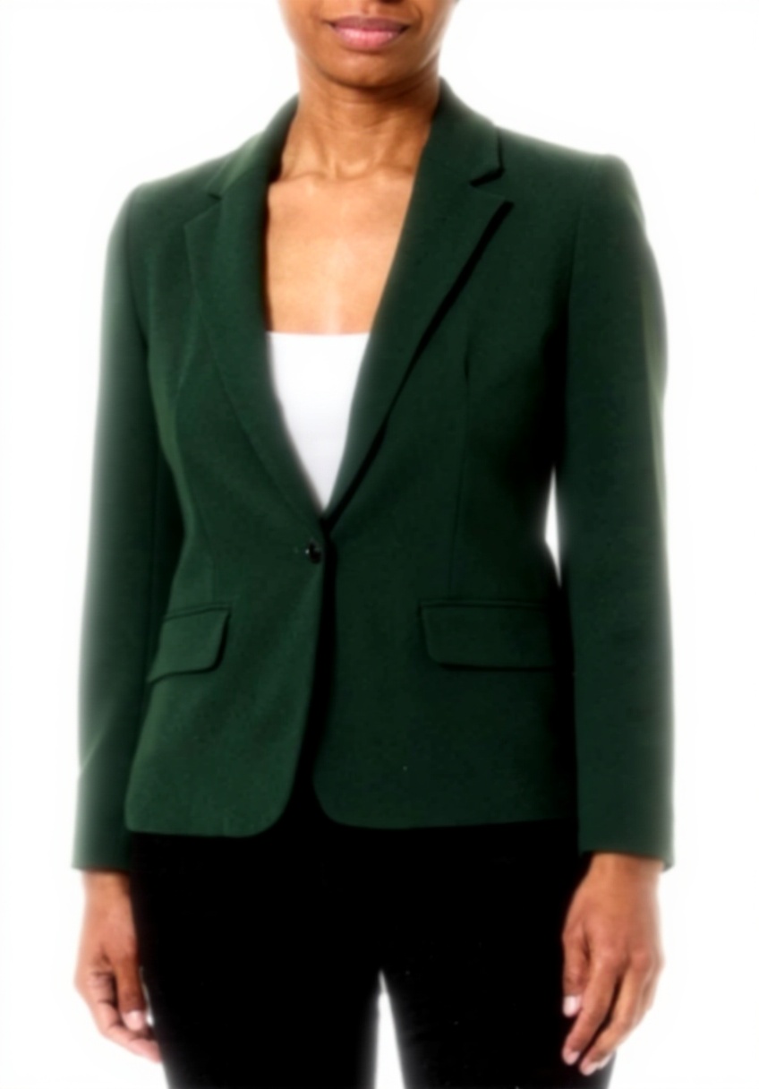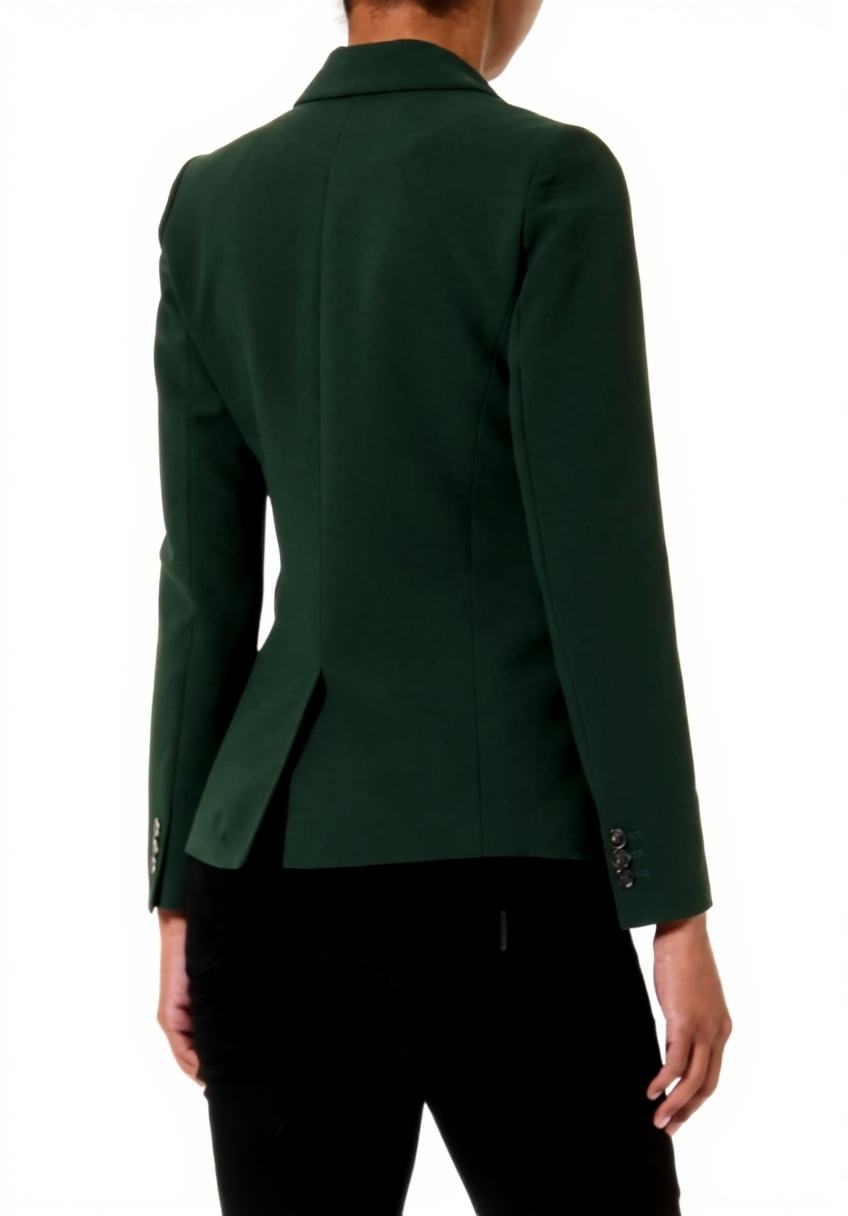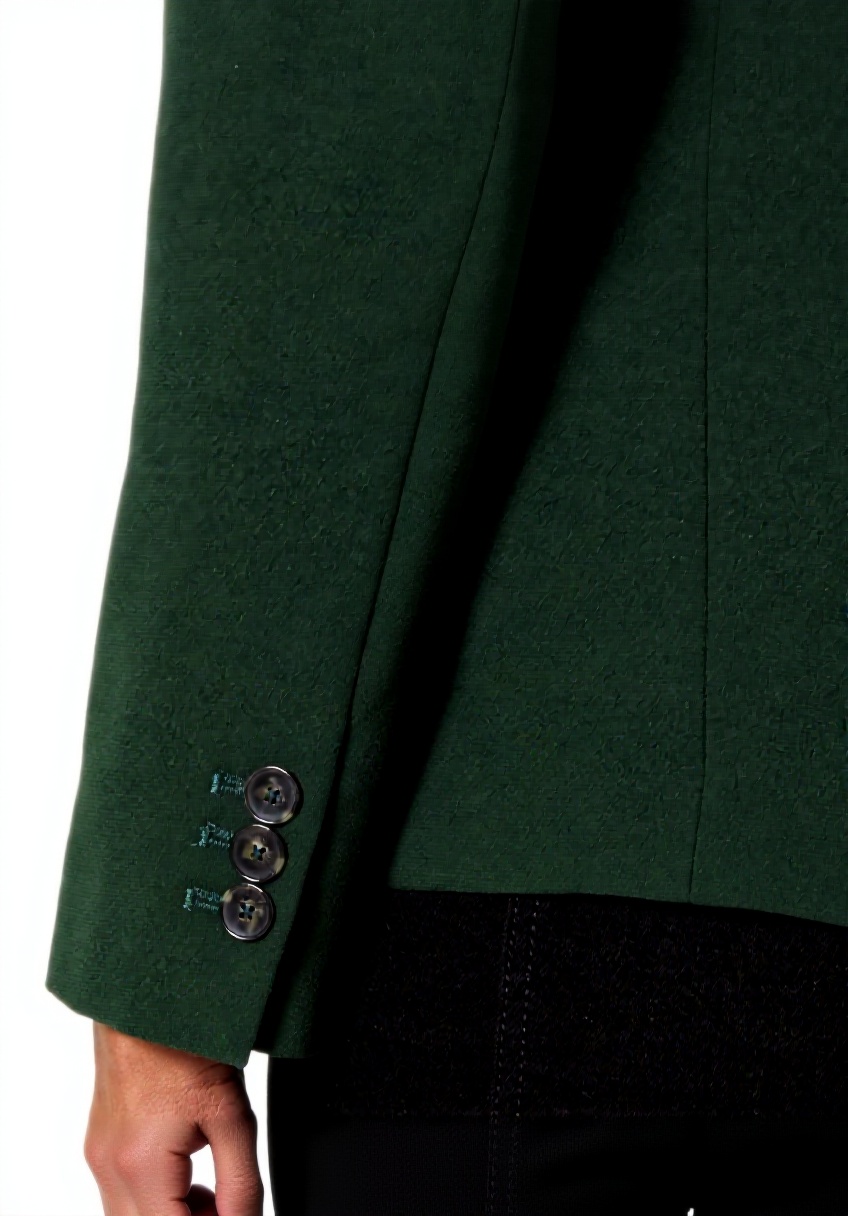 Ce blazer se distingue par sa couleur Sapin unie, sa coupe ajustée qui met en valeur la silhouette, et ses finitions de qualité incluant un col tailleur, des manches longues, des poches à rabat avec fermeture par bouton, et une fente d’aisance au dos pour un confort optimal.