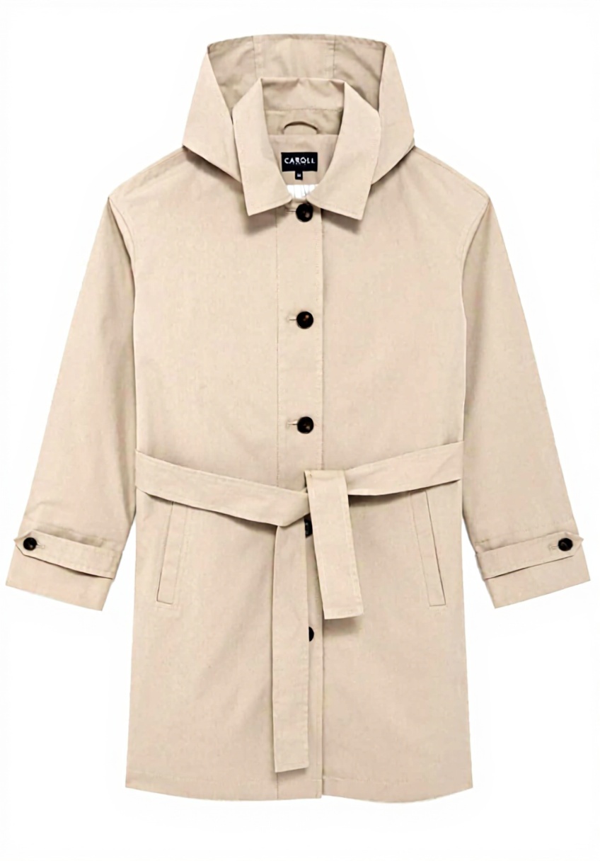 Le trench est disponible en tailles 36, 38, 40, 42, 44 et 46, avec une couleur beige universelle. Fabriqué par Caroll sous la référence 242G-GABARDINE, il assure un ajustement précis et un confort optimal grâce à ses matériaux sélectionnés.