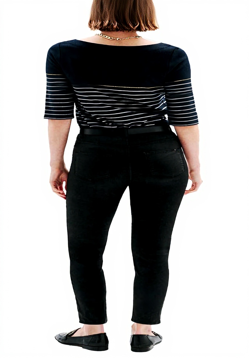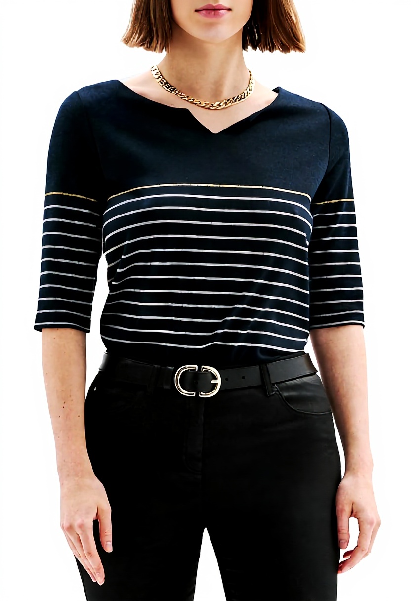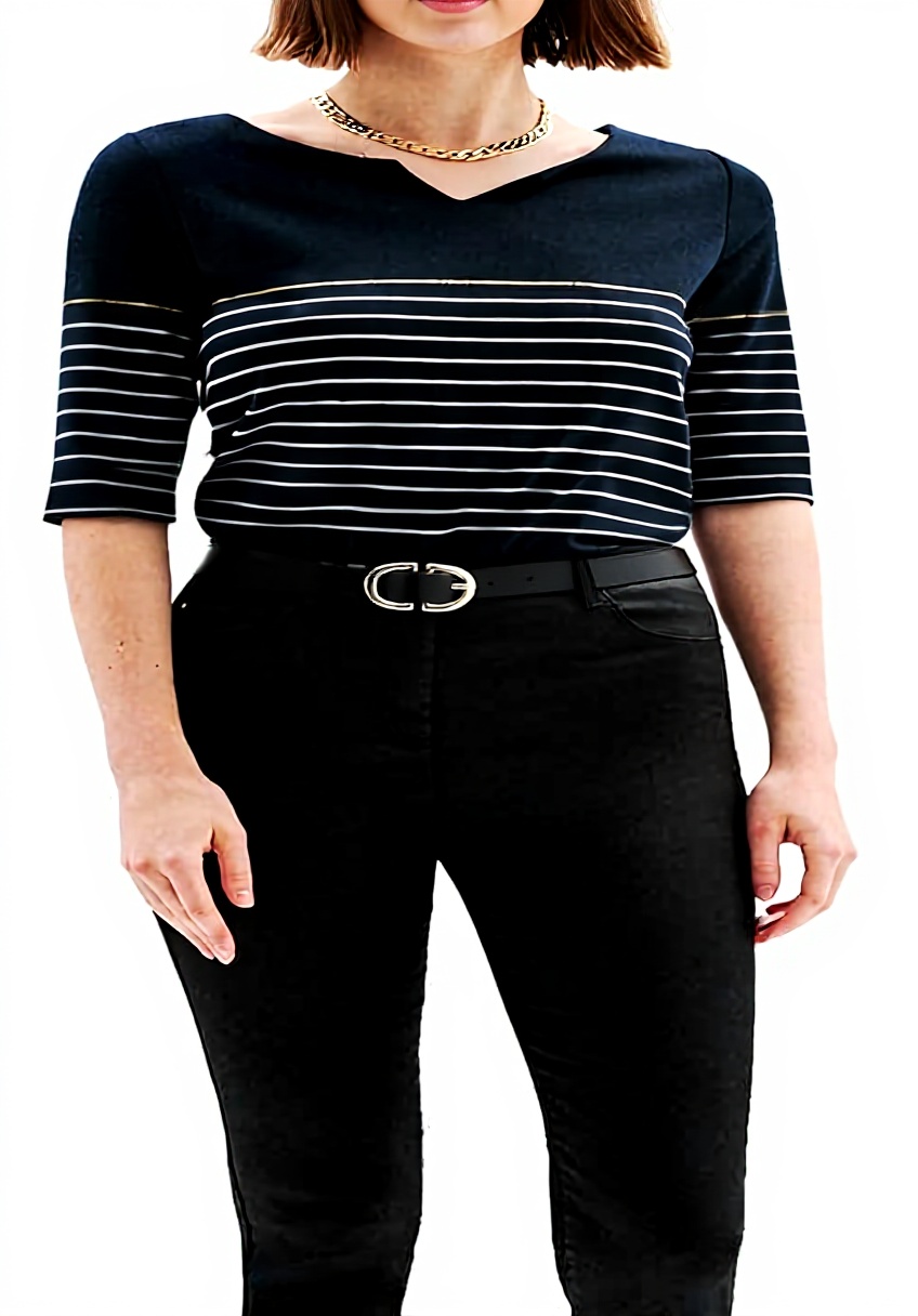 Le motif marinière, toujours dans l’air du temps, se marie ici à une coupe droite qui tombe naturellement sur le corps. Les manches 3/4 offrent cette longueur pratique qui convient à la plupart des saisons, tandis que le col tunisien apporte une élégance discrète. En le portant, on remarque comment le tissu garde sa forme au fil des lavages, et la façon dont les coutures sont réalisées assure un confort durable.