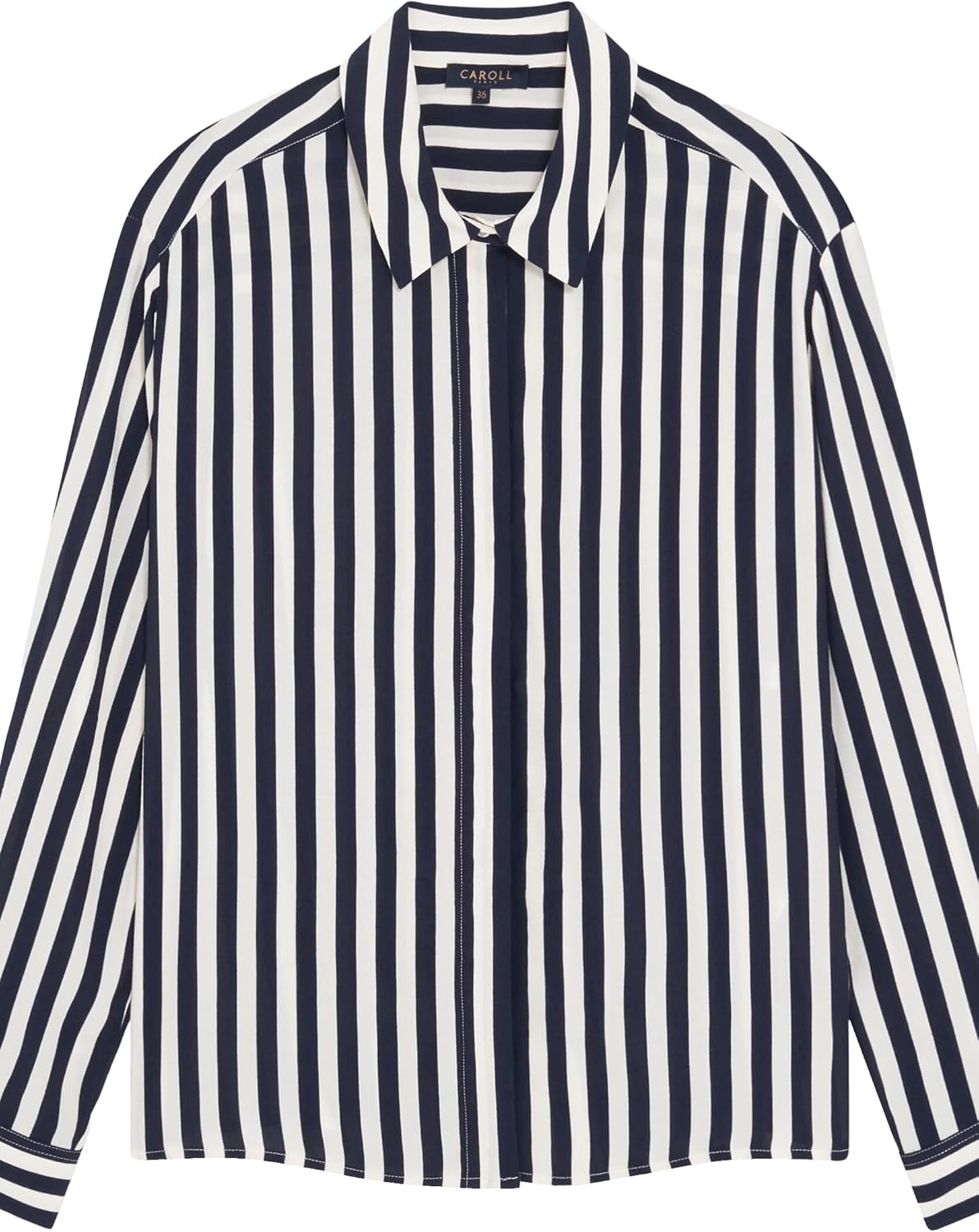 La chemise à rayures Caroll est un modèle emblématique qui allie élégance et praticité. Conçue avec soin, elle met en valeur un design rayé intemporel, parfait pour les femmes recherchant une pièce versatile et confortable.
