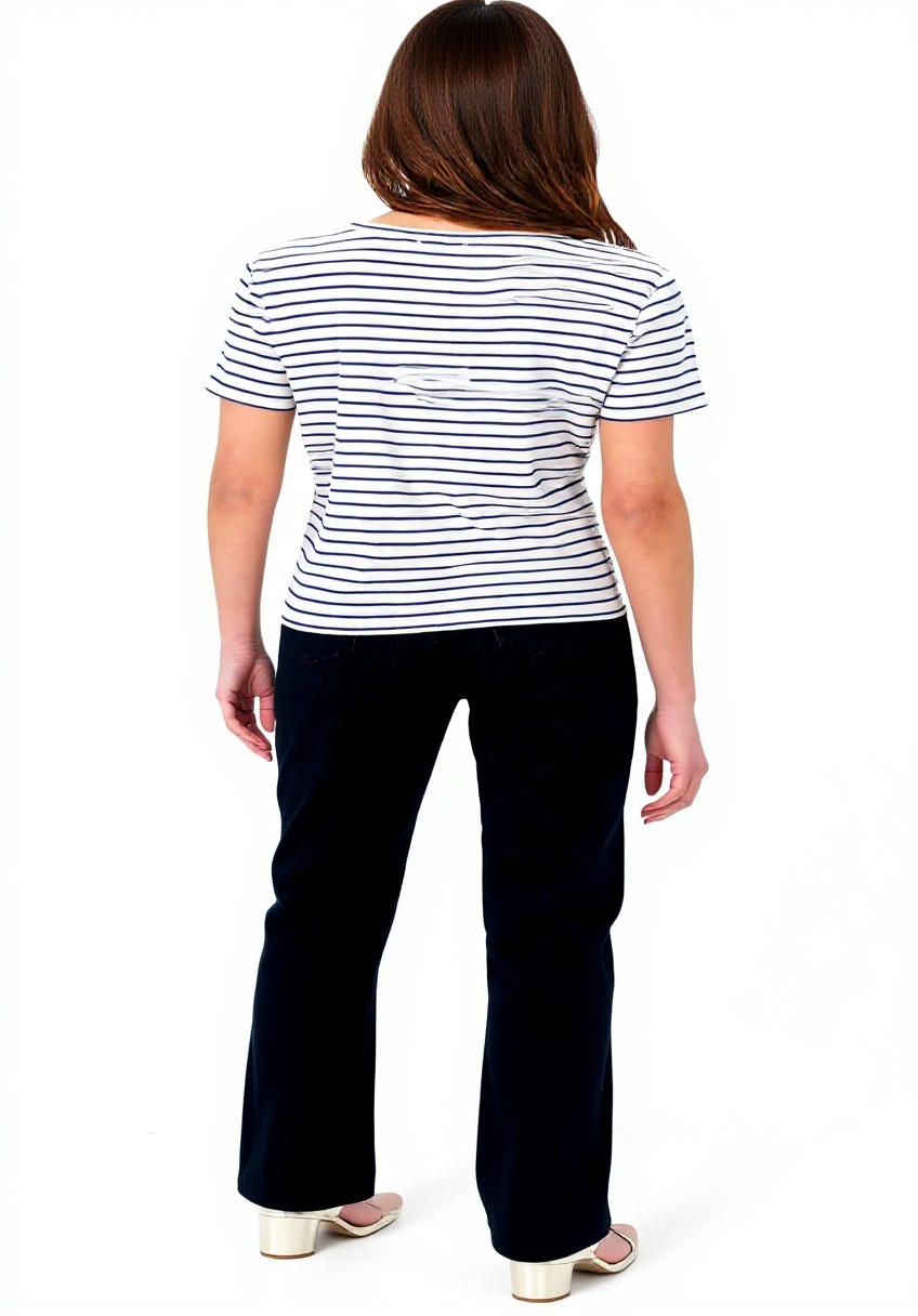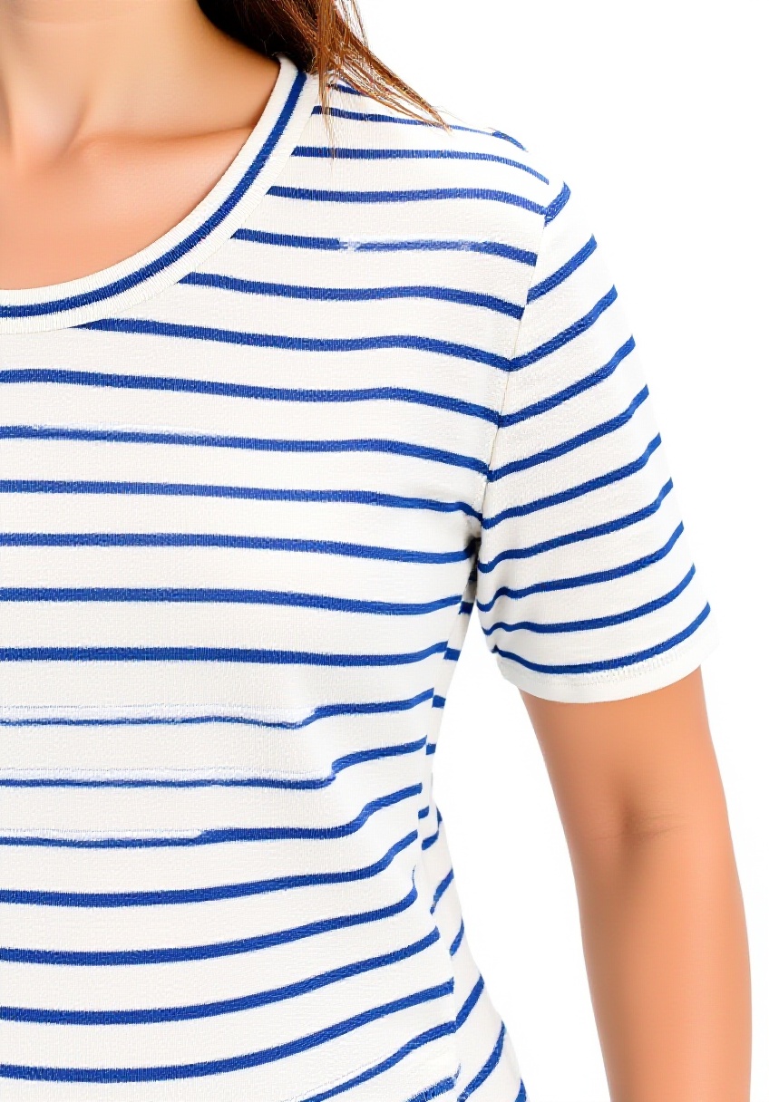 Le T-shirt présente des rayures marinières classiques, une coupe droite ajustée sans être serrée, et un col rond pour un look décontracté. Fabriqué en coton de qualité, il assure une respirabité et un confort tout au long de la journée.